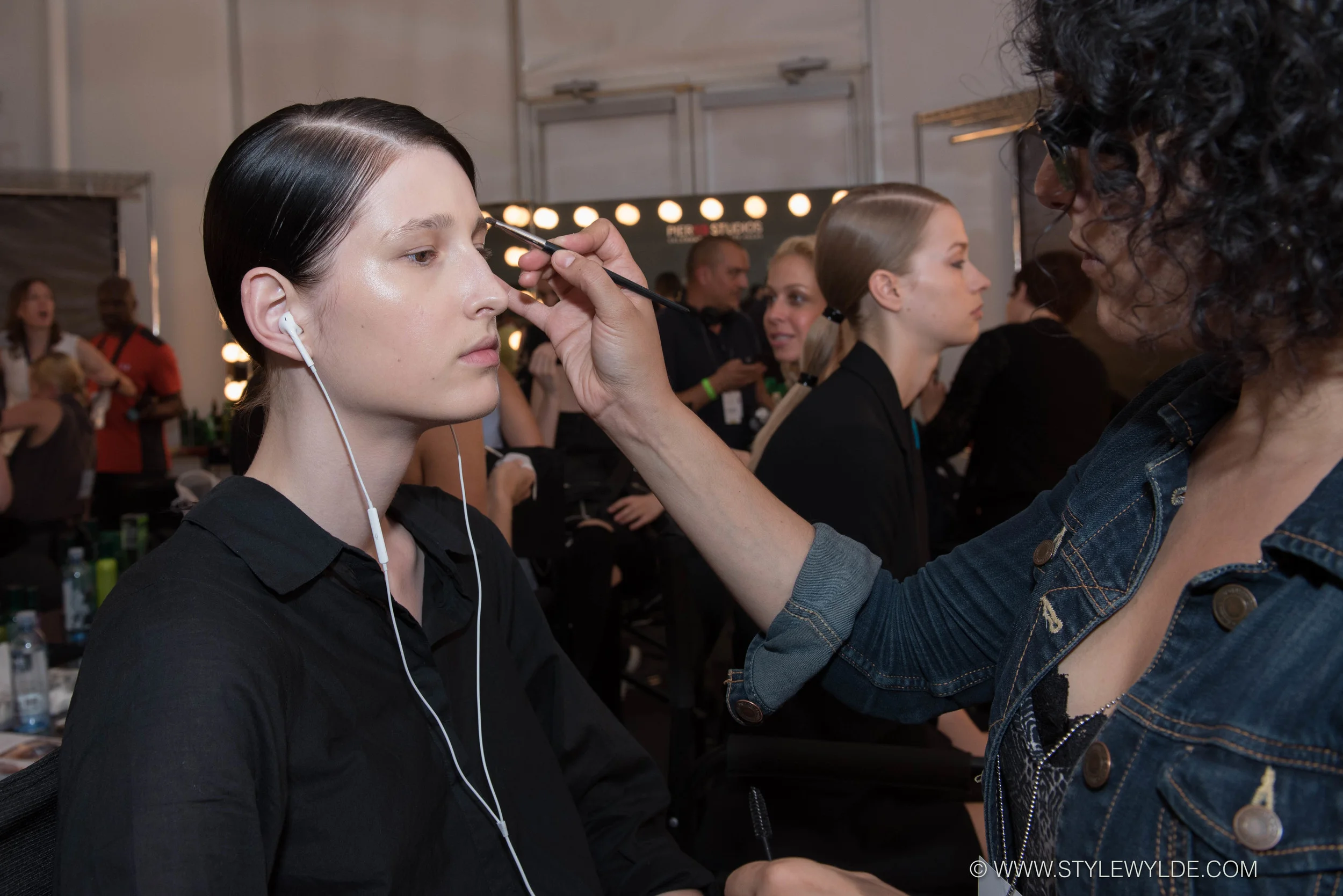 Backstage at the Demoo Parkchoonmoo Spring 2016 collection teams from René Furterer (led by Rita Marmor) and Shiseido (led by Colleen Runné) worked quickly, like well oiled machines to create the sleek and futuristic but not "hard" look created to compliment the collection. Hair was smoothed into a deep side part using Rene Furterer Vegetal Mousse and Vegtal Finishing Spray. It was then pulled into a multi-section pony (for longer hair) flat ironed and finished with Rene Furterer Glossing Spray. While this was going on, over on the Shiseido side of the room make-up was kept ultra minimal with only a dark-waterlined eye emphasized and skin left natural with only the most minimal concealer used where absolutely necessary. (see Shiseido notes below)