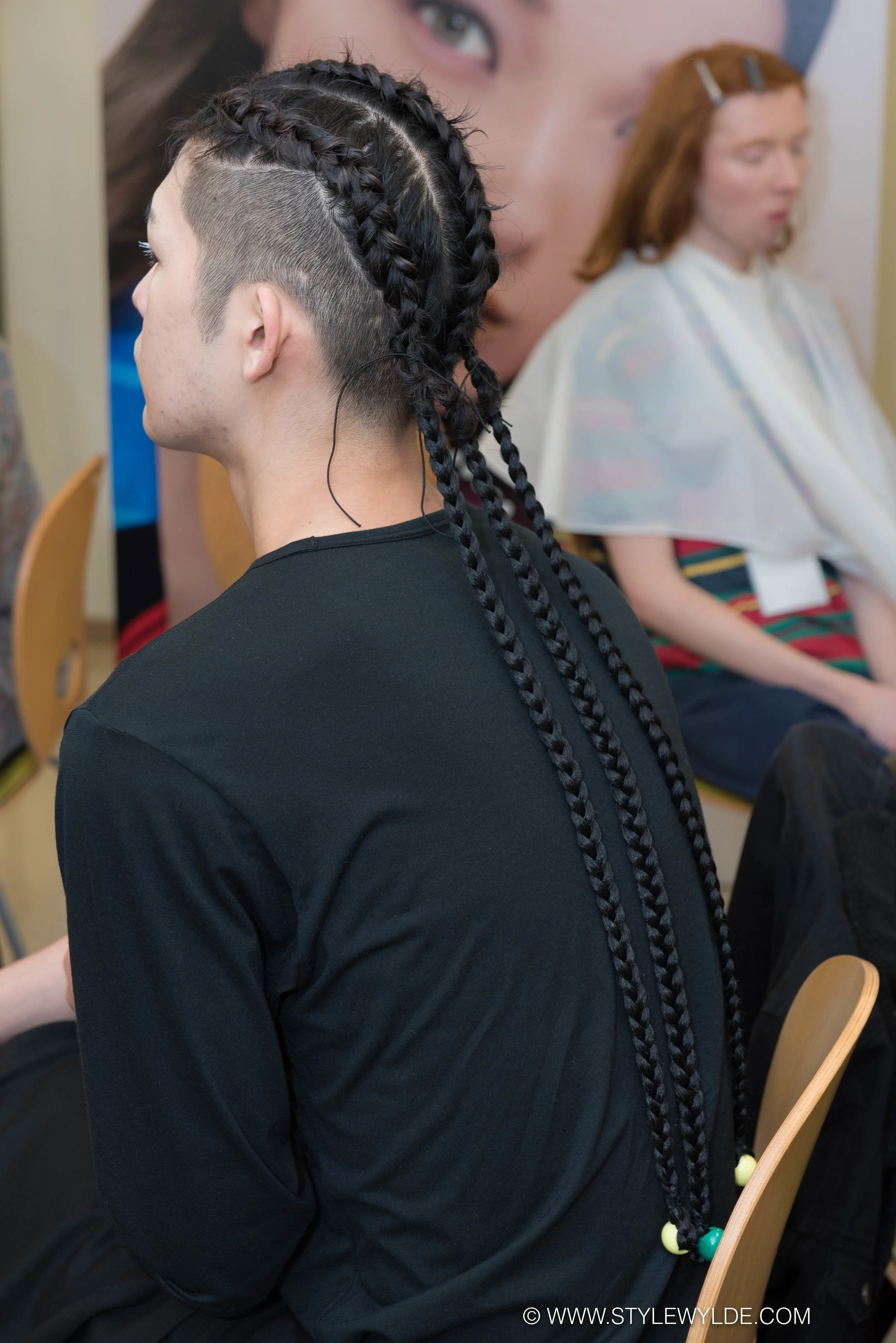 Braids, twists, and natural hair were a major trend for men on the Amazon Fashion Week Tokyo runways; and nowhere were these tough-to-execute-properly looks better done than backstage at the Discovered Fall 2017 show. Backstage before the big event the team from Shiseido Japan showed off their creativity, talent, and nimble fingers working hair of all textures into a wide array of shapes. To complete the model transformation to runway-ready the team then paired the look with clean skin and a shock of bright white mascara to give models a hyper cool, futuristic punk-meets-urban vibe that was one of the best looks (male or female) we saw this season.