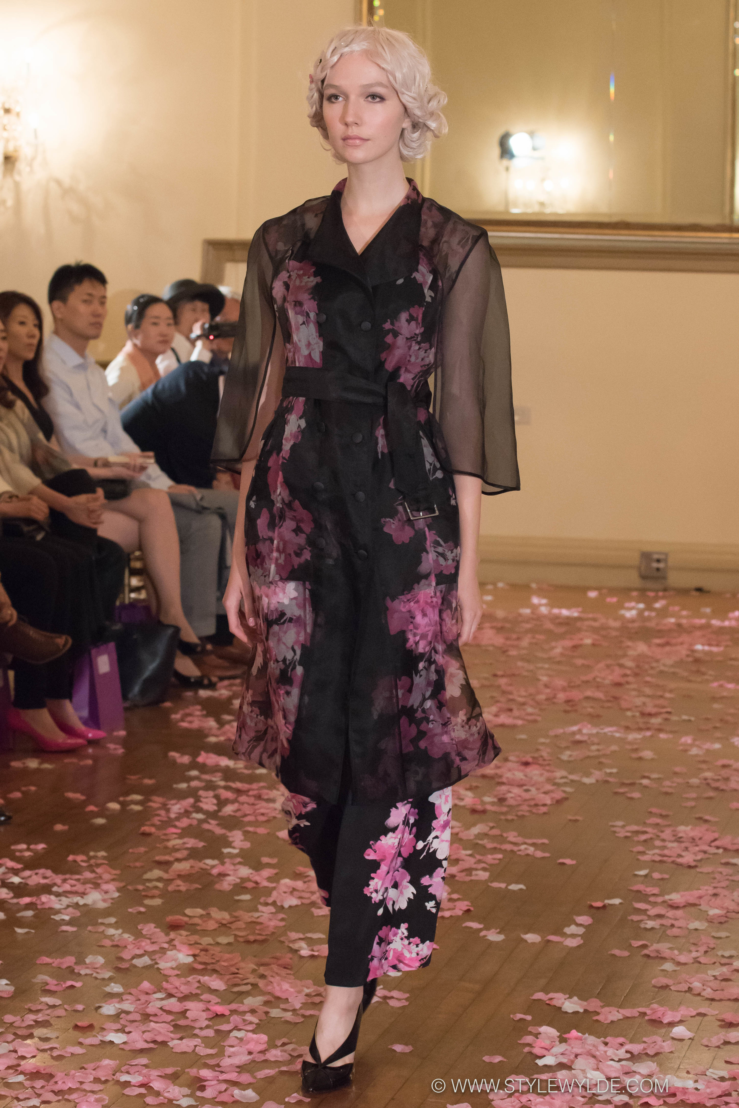 Sheer florals, lace, and silks in classic silhouettes got a fun and funky twist at the Yuna Yang Spring 2016 show as models emerged wearing pale pink and lavender wigs that were encrusted with vintage inspired pins and jewels.