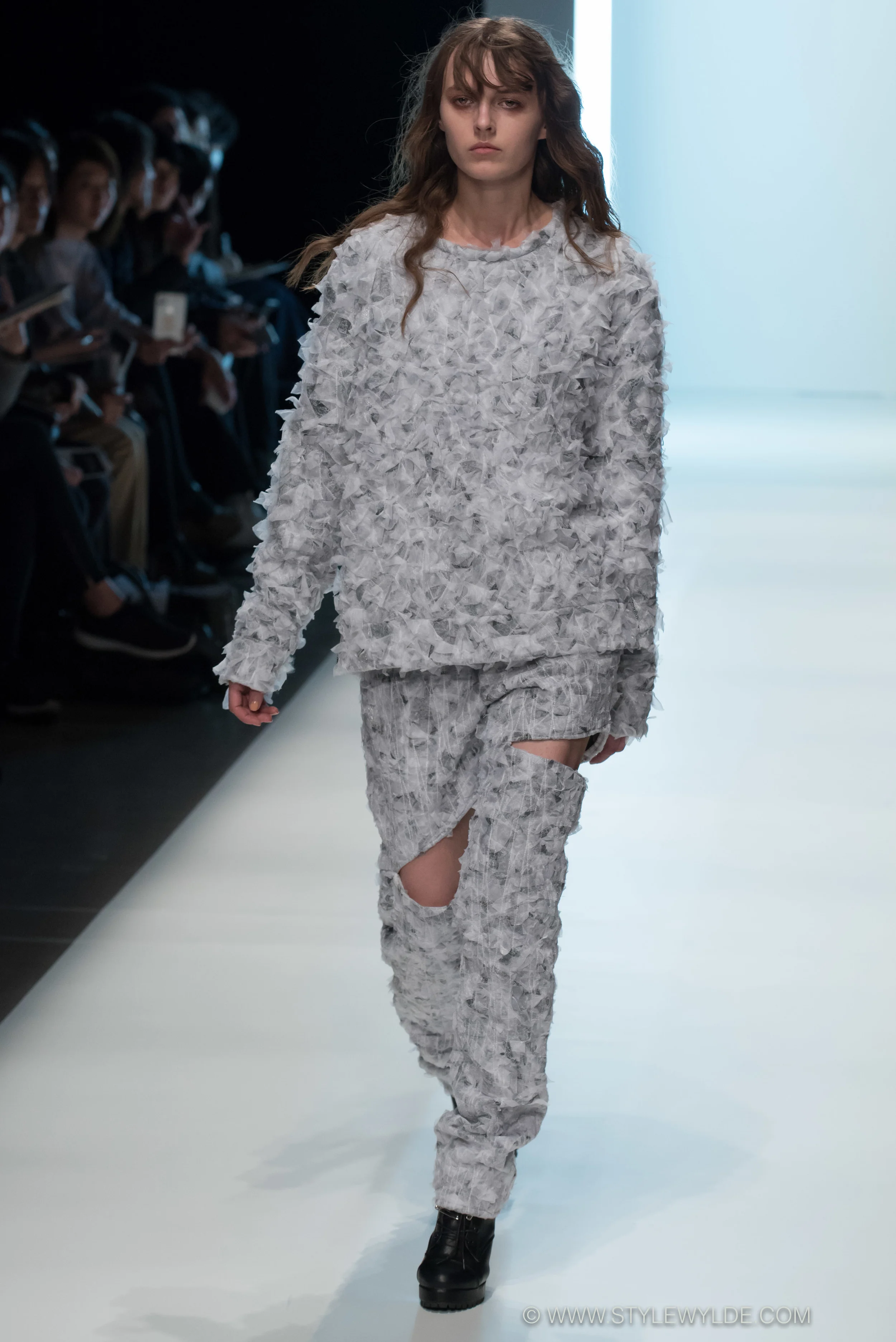 Cinematic imagery has been a reoccurring theme in the work of designer Johan Ku. For the Spring 2016 season he drew on the art film "Death in Venice", this time around however, he drew on a seemingly more low-brow film and looked toward the horror classic "The Thing" for inspiration. In the hands of Ku, however, nothing is ever low-brow. His Fall 2016 collection built on imagery such as freshly fallen snow, ice crystals, and yes even monstrous appendages that looked as though they were literally bursting from model's bodies, and elevated it all to wearable-art status. The first section of the collection featured highly textured black and grey knits that played with volume, cut and silhouette in interesting ways. The pieces then evolved, like a movie-monster changing its shape to better stalk its prey, into a section of seemingly white looks that were photo-sensitive and glowed an alien blue-green hue under the darkened runway (see detail shot below.) In the final section, the monster fully evolved into a furry arachnid like look that included actual arms encircling the pieces in a menacing embrace. Wild? Yes, but also fashion-genius. The only concern will be next season in Tokyo when Ku fans everywhere have snapped up the pieces to wear to his show, how will all those alien arms fit in the audience?